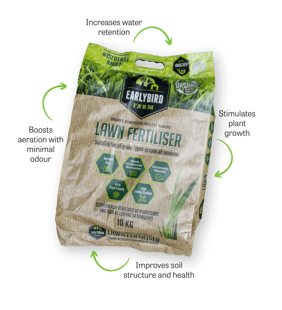 Earlybird Farm Lawn Fertiliser provides long-lasting lawn nutrition through all seasons thanks to its high macronutrient content and has a few key benefits.